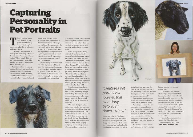 I’m delighted to have been featured in the Sept 2018 edition of the UK Agility magazine ‘The Agility Voice’. Some of my favourite portraits of 2018 were shown including the wonderful Sultan the Suffolk Ram! The article explores the journey of creating a pet portrait and how I go about ensuring each portrait reflects my subject’s true personality and spirit.